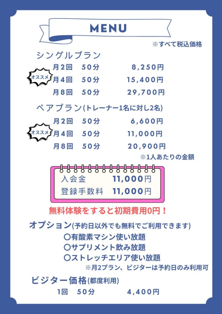 ジムの設備やオプション内容もわかりやすくご説明いたします。